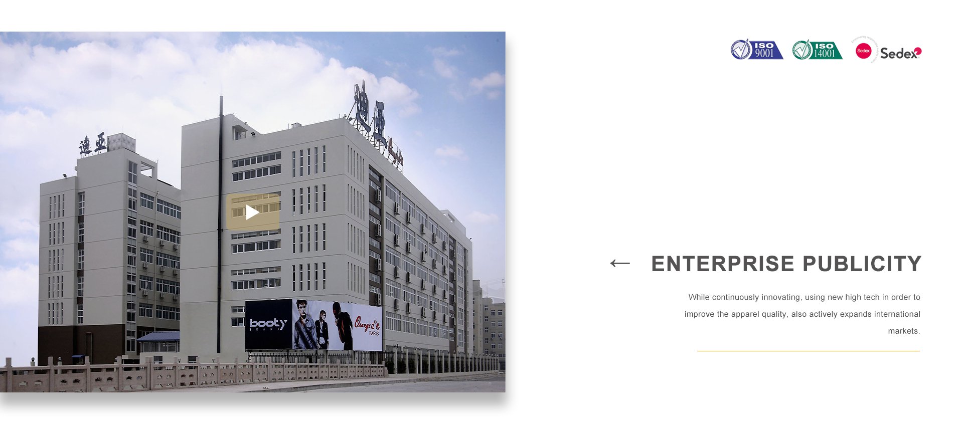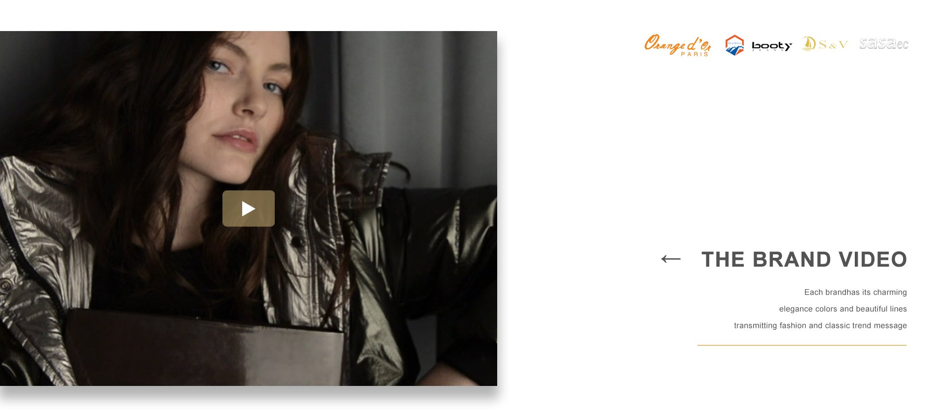 品牌建設(shè)是公司堅(jiān)持不懈的追求,我們每年都會積極參加國內(nèi)外舉辦的各大服裝展銷會。憑借著良好的質(zhì)量與信譽(yù),市場占有率在逐漸擴(kuò)大,產(chǎn)品遠(yuǎn)銷歐洲、美洲、亞洲等國。公司以生產(chǎn)棉衣、羽絨服、派克、大衣、夾克、運(yùn)動休閑服飾等為主,旗下主打品牌有 ORANGE D’OR 、CLAIRVAL、BOOTY JEANS 、S&V和SASAEC,各品牌服飾均以典雅的色彩、優(yōu)美的線條、卓越的魅力吸引著都市麗人,將時(shí)尚、經(jīng)典的潮流信息予以淋漓盡致的演繹。